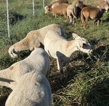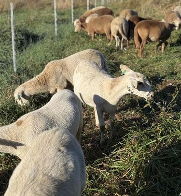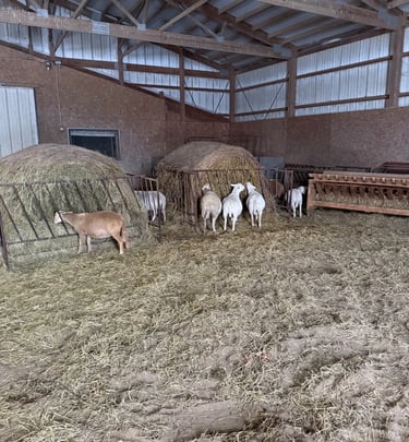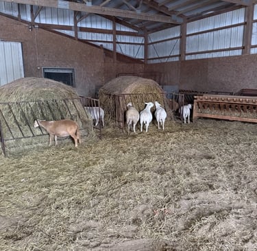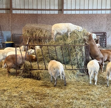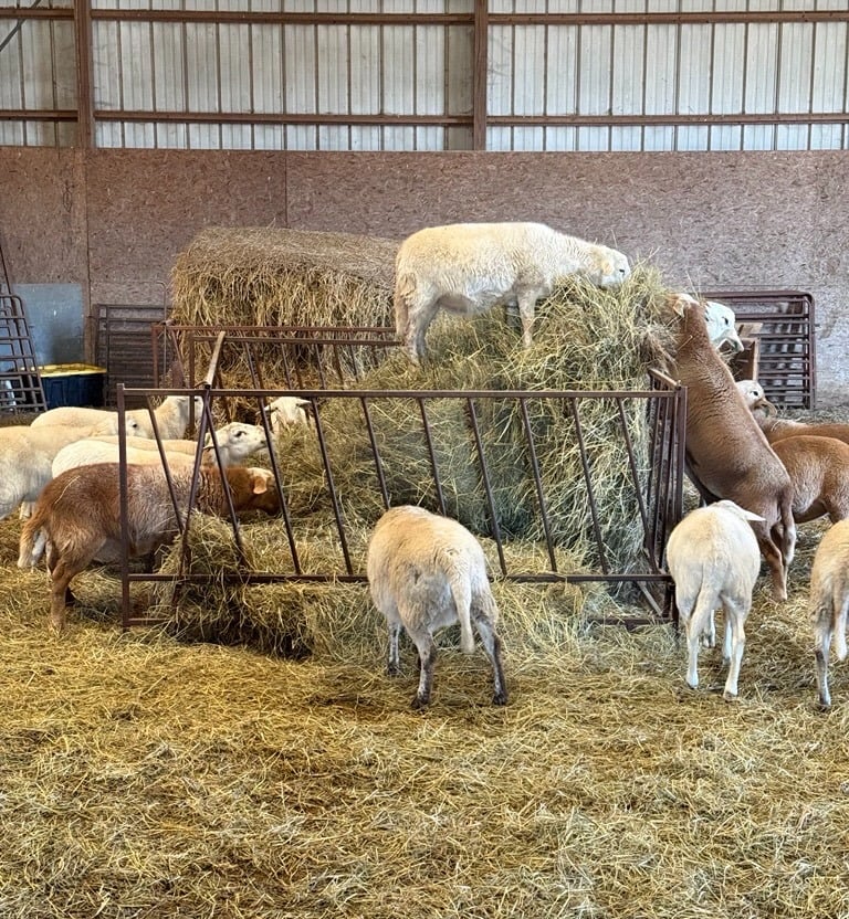 Dry Lot Hay & Alfalfa: During the off-season or critical growth periods, we supplement with high-quality hay and alfalfa. This ensures our ewes have the "fuel" they need for healthy lambs and Elon stays in peak breeding condition.